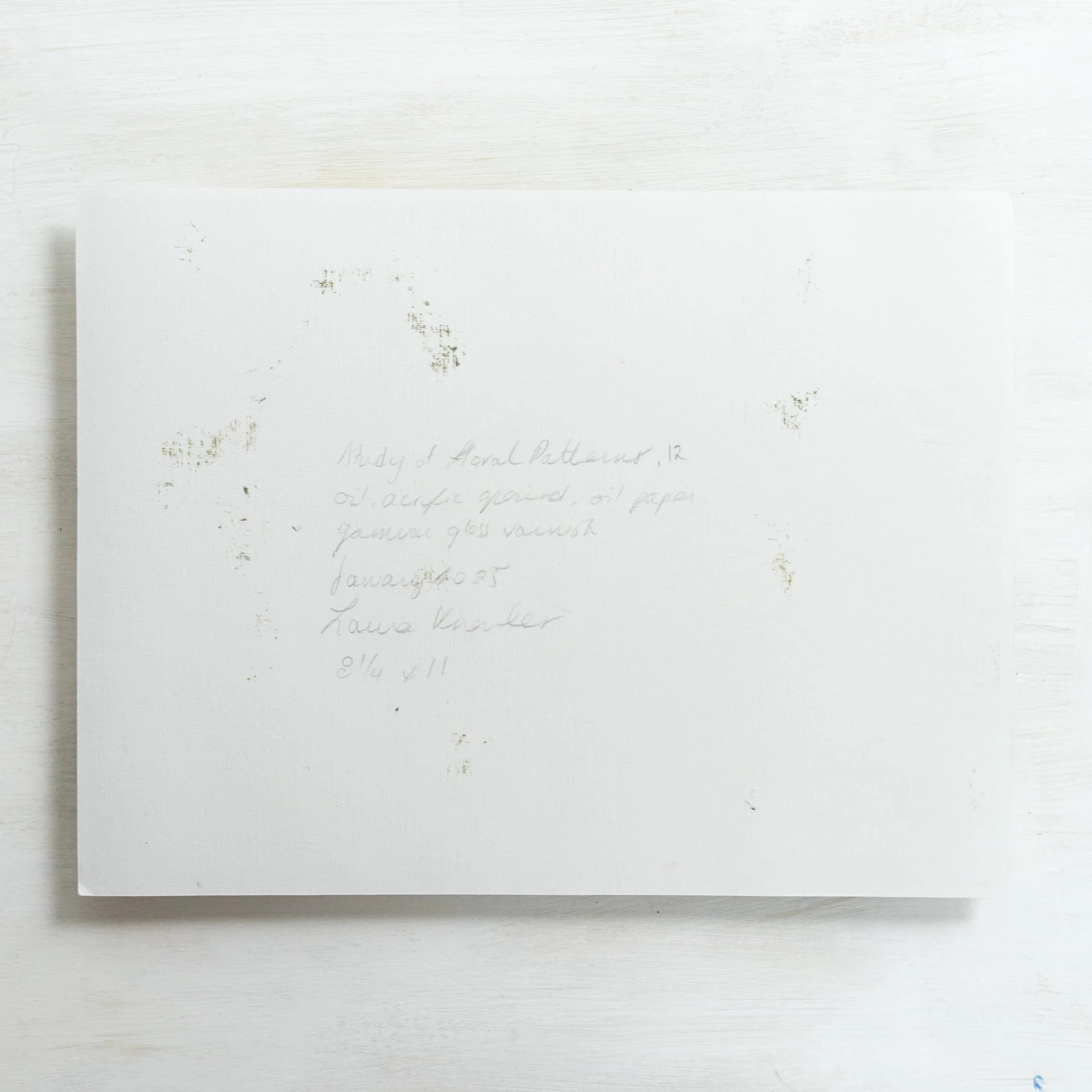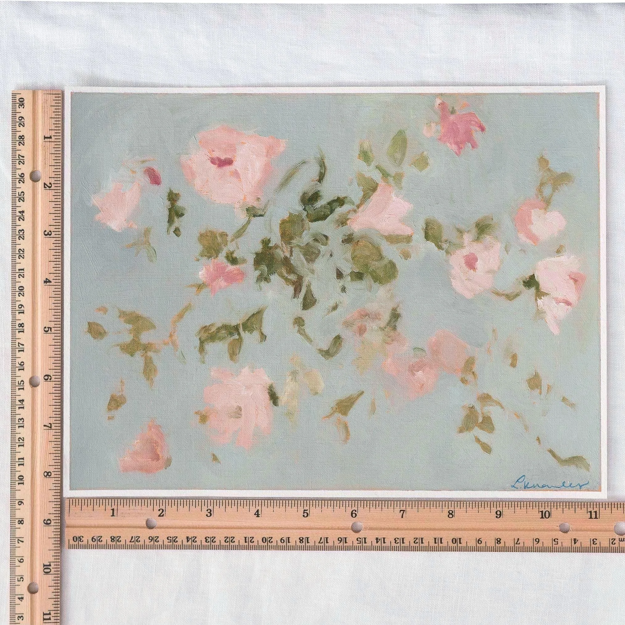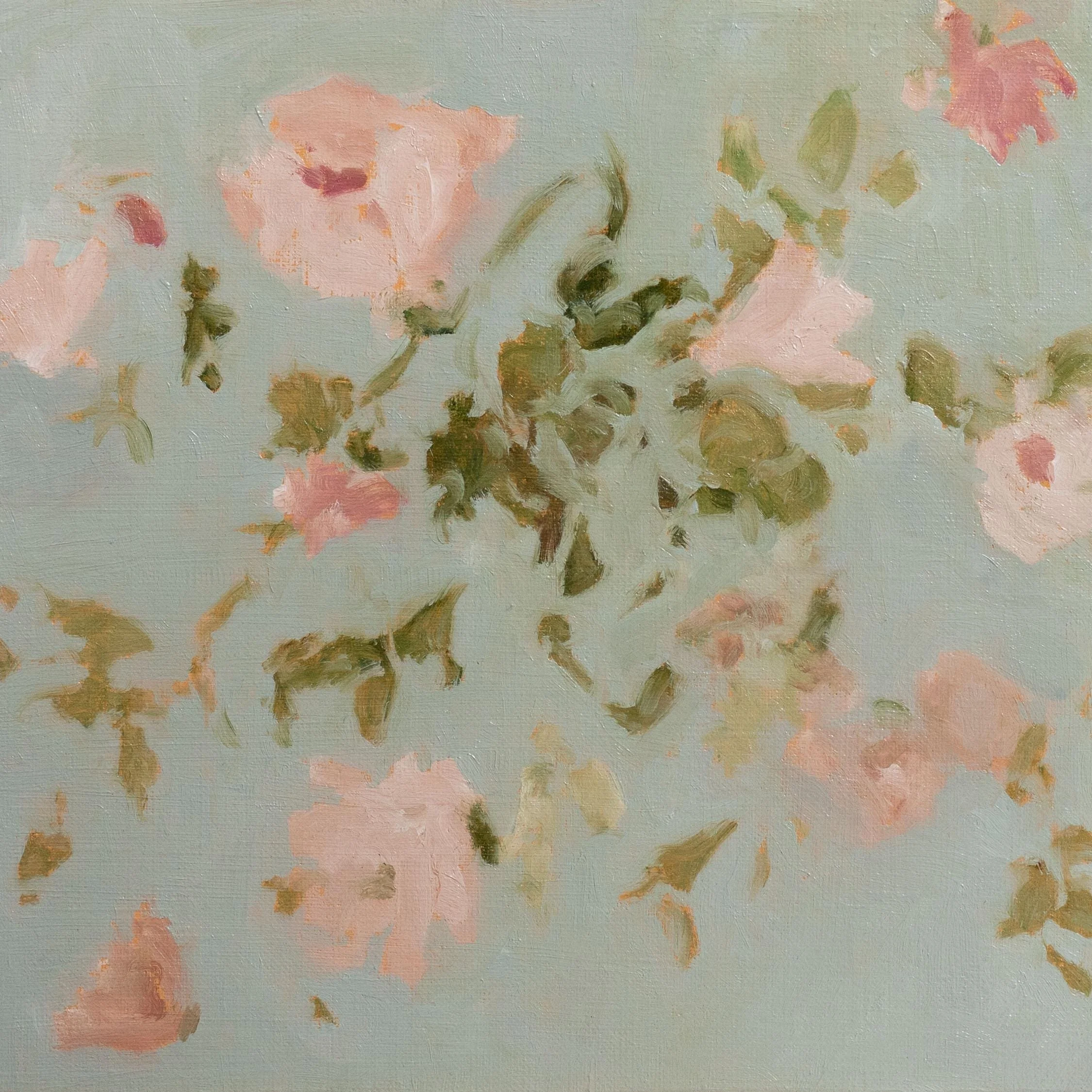 "Study of Floral Patterns, 12" is a gestural study of small pink florals and warm green leaves, set against a soft blue background. The composition is loose and painterly with a focus on pattern and gentle contrast. The layered shapes, textures, and softened edges reflect my painting process.
