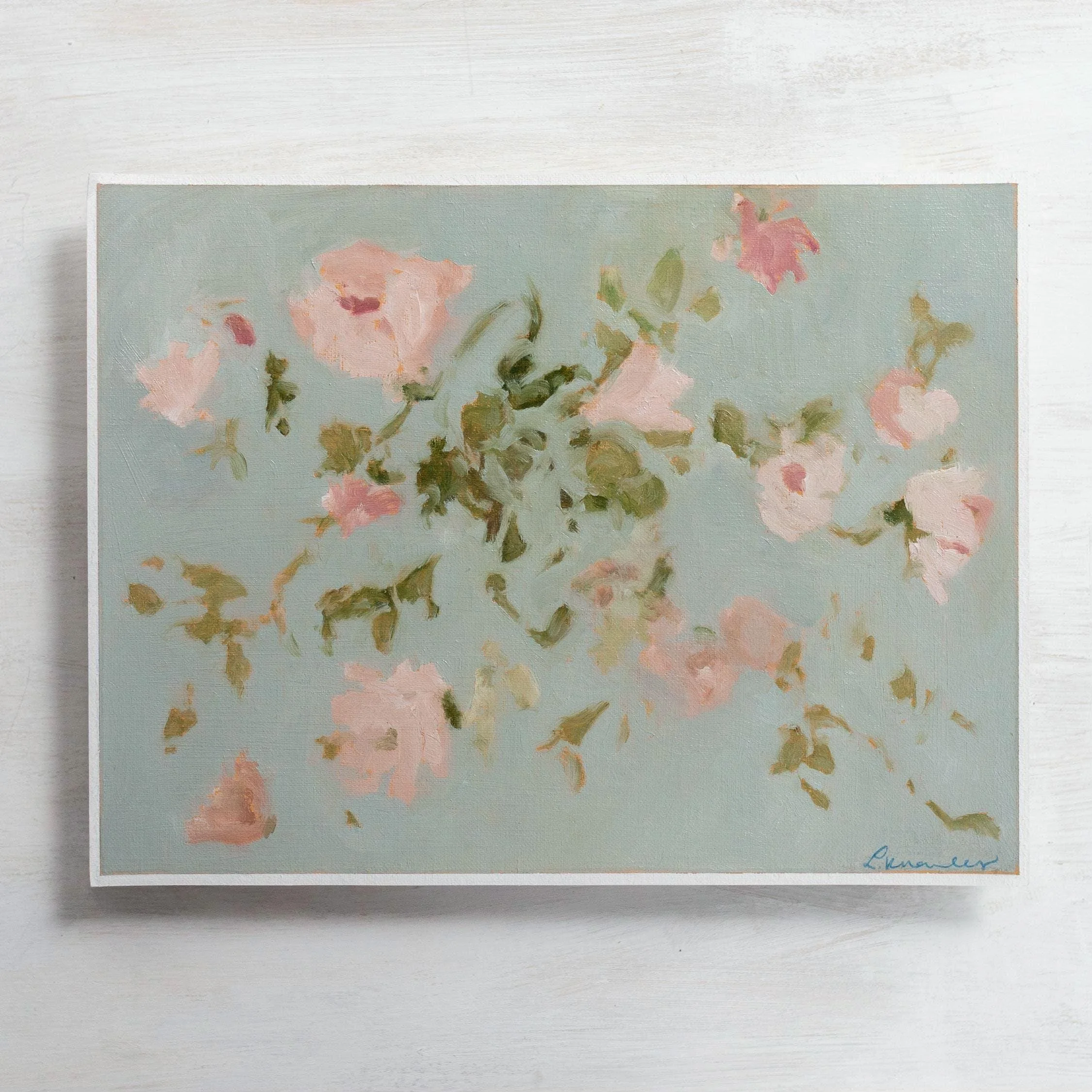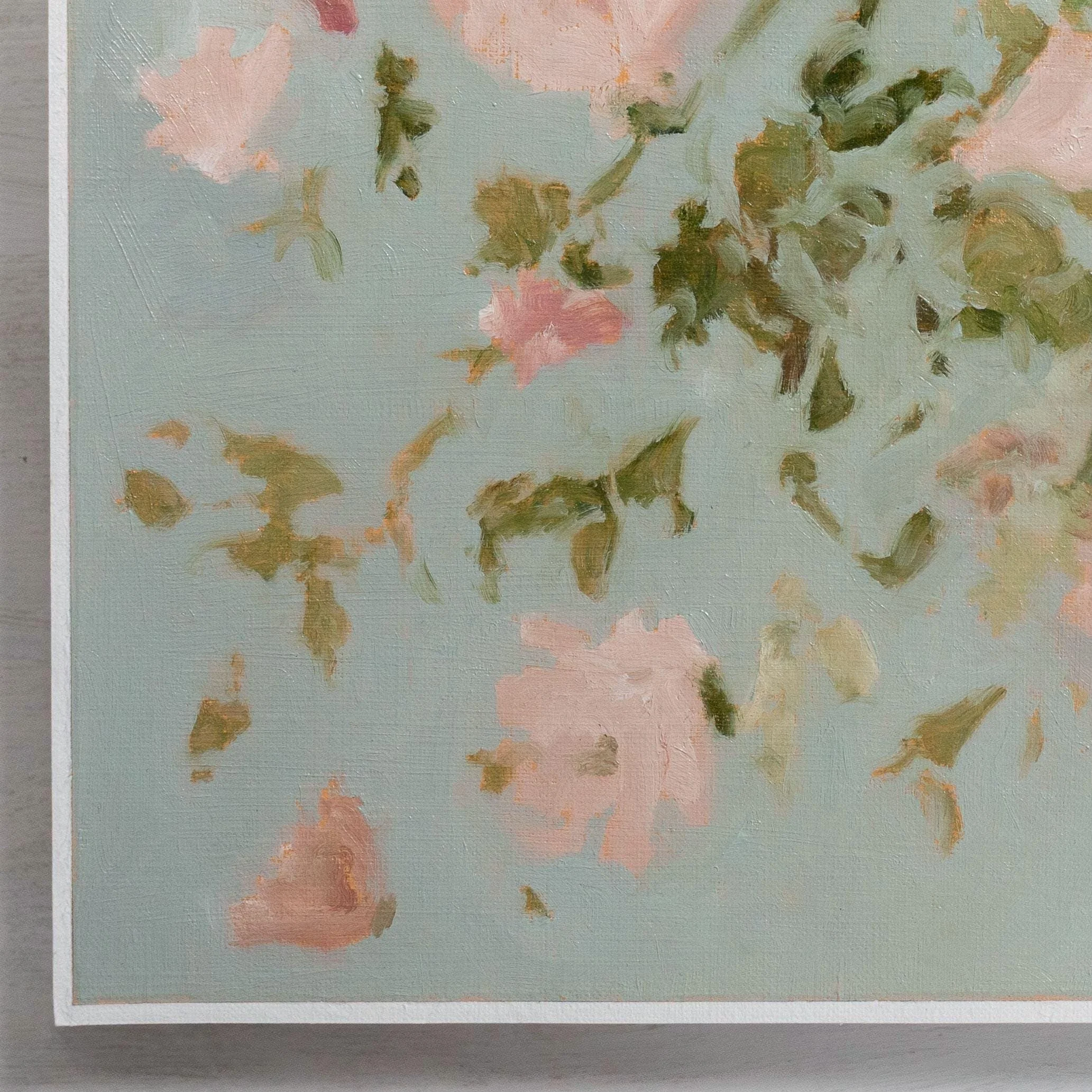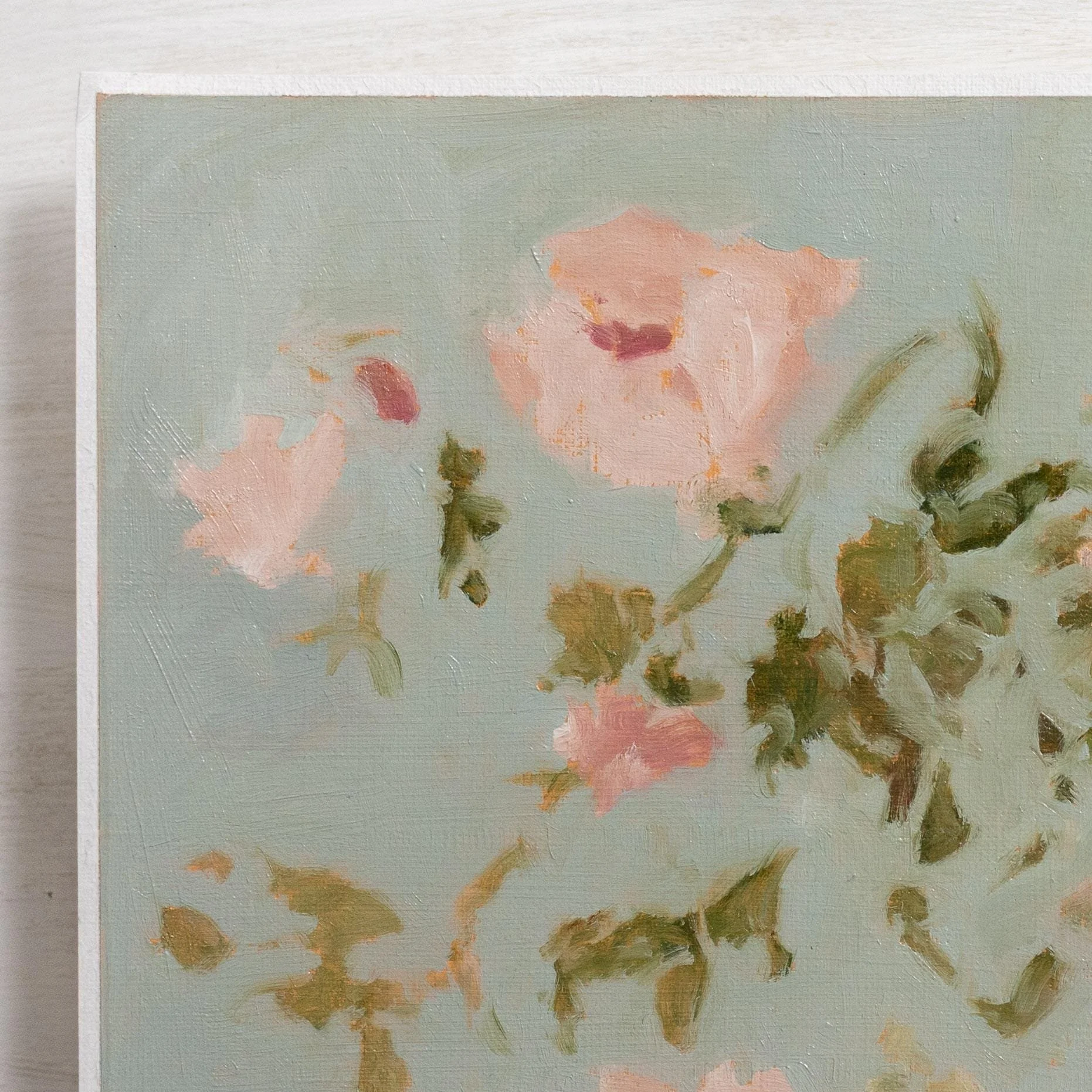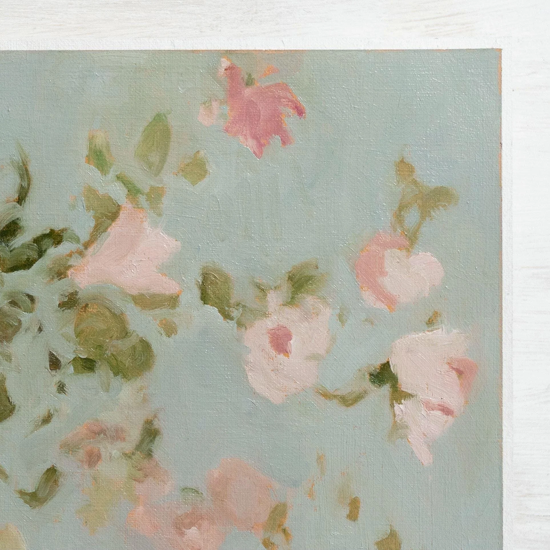 "Study of Floral Patterns, 12" is a gestural study of small pink florals and warm green leaves, set against a soft blue background. The composition is loose and painterly with a focus on pattern and gentle contrast. The layered shapes, textures, and softened edges reflect my painting process.